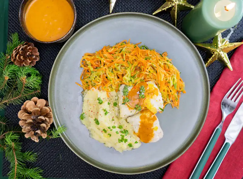 Lachsfilet in einer Soja-Lemongrassauce, serviert mit gedämpften Karotten, Brokkoli, Zuckerschoten und Rettich.