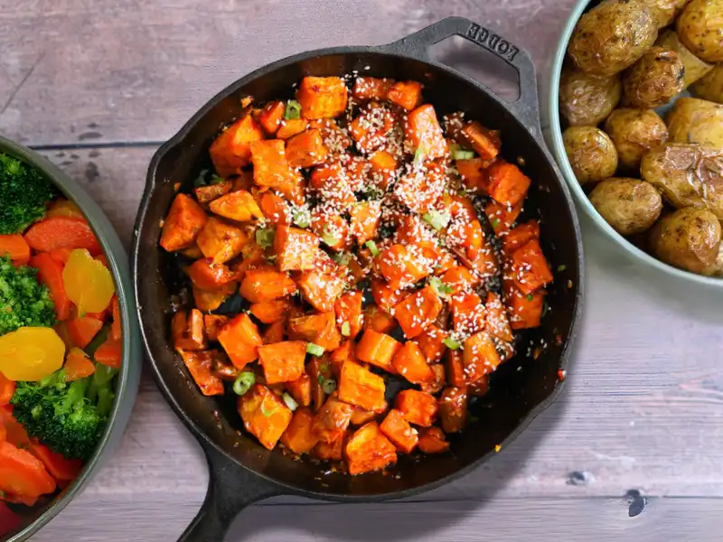 Planted Pflanzliches Poulet in einer Hoisin-Sauce mit sojageschwenktem Gemüse und Reis