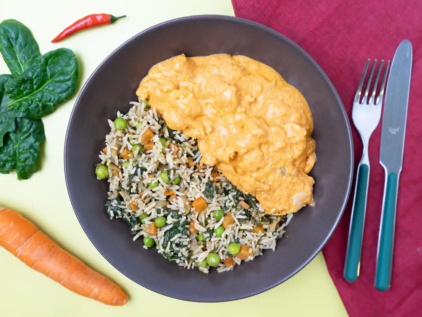 • Portioniert für 3. Wählen Sie Ihr Fleisch, Protein und Gemüse