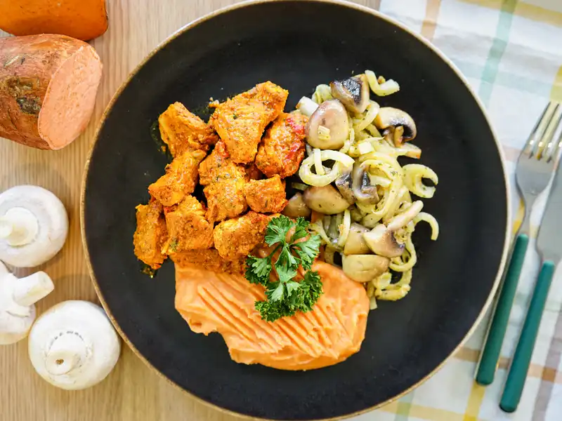 Succulent filet de poulet enrobé d'épices massala, servi avec un curry de carotte et des épinards à l'indienne.